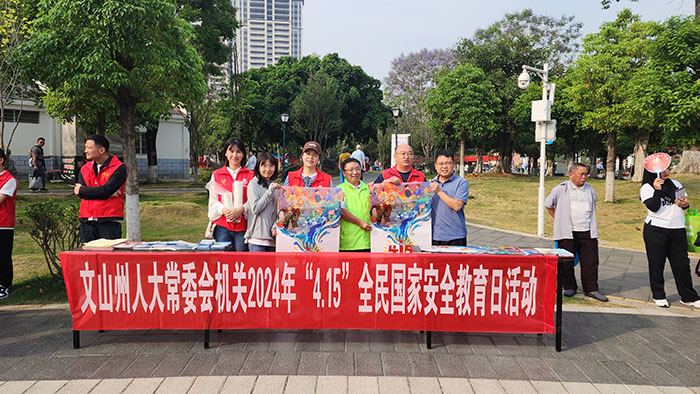 2024年4月15日,是我国第九个全民国家安全教育日,为深入学习贯彻总体国家安全观,切实增强全民国家安全意识,营造全民遵法、学法、守法、用法的良好氛围。4月13日,州人大常委会机关组织干部职工在文山总体国家安全观主题公园广场开展“4·15”全民国家安全教育日主题宣传活动。