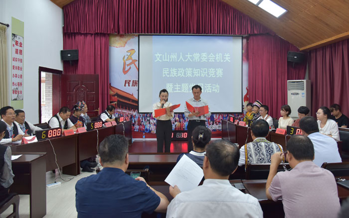 开展一次民族政策知识竞赛是州人大常委会创建民族团结进步示范机关十项主题活动之一。当天的竞赛活动共有办公室代表队、研究室选联委代表队、社会建设教科文卫代表队、法制法工委代表队、财经预算委代表队、民侨农环委代表队6支代表队参加。竞赛题目分为必答题、抢答题、风险题三种,内容涉及《中华人民共和国民族区域自治法》《云南省民族团结进步示范区建设条例》《文山州创建民族团结进步示范州知识问答》《文山州创建民族团结进步示范州知识读本》。竞赛活动设置一等奖1名,二等奖2名,三等奖3名。(段志丹)
